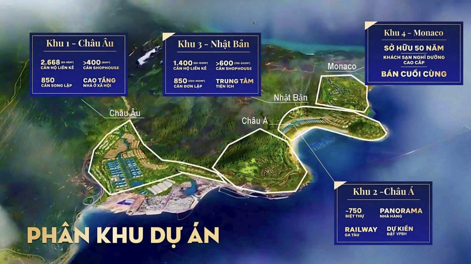 Dự án được quy hoạch thành nhiều phân khu chức năng riêng biệt, đáp ứng đầy đủ nhu cầu sinh sống, nghỉ dưỡng, kinh doanh và giải trí. Tổng thể thiết kế mang tinh thần giao thoa Á – Âu, mỗi phân khu sở hữu phong cách riêng nhưng vẫn thống nhất trong không gian sinh thái hài hòa giữa núi, rừng và biển.